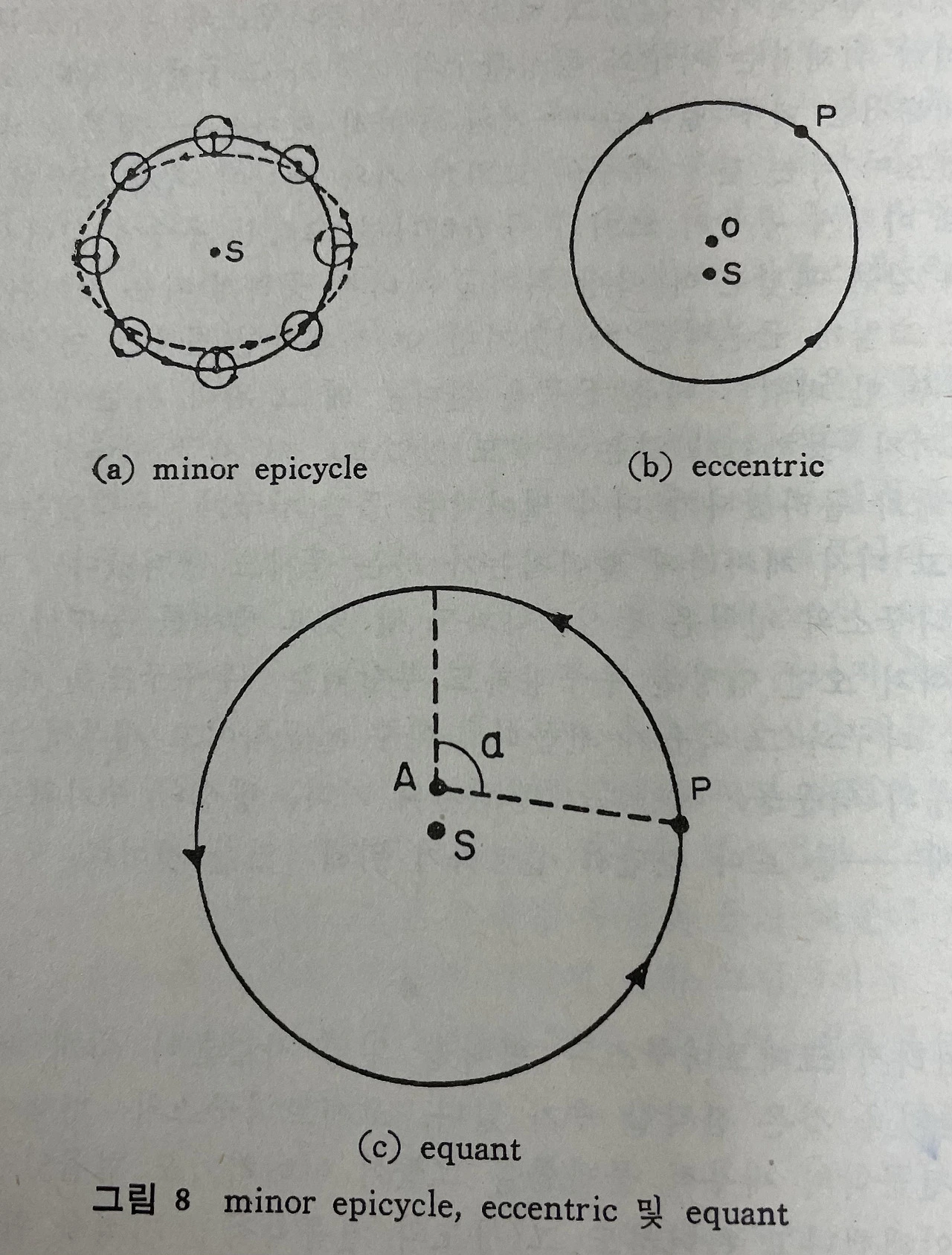 이런 어려움의 이유는 실제로 행성의 운동이 등속원운동이 아니라 부등속 타원운동을 함에도 불구하고 프톨레마이오스와 코페르니쿠스의 우주구조 두 가지가 다 행성의 운동을 등속원운동들로 기술하는 데 있다... 단순한 원운동 하나로는 불가능하고 위에서 본 epicycle 또는 eccentric, equant 같은 것들을 필요로 하게 된다... 그리고 이렇게 타원운동을 나타내 주기 위해서 도입한 epicycle을 역운동을 위해 도입한 epicycle과 구분하기 위해서 minor epicycle이라고 부른다...