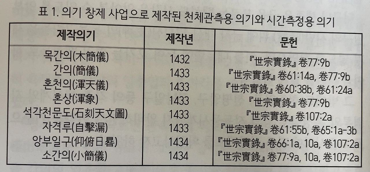 89/ ... 이때 제작된 의기들은 의상儀象으로 대소간의大小簡儀, 대소규표大小圭表, 대소일성정시의大小日星定時儀, 혼상渾象, 혼의渾儀, 그리고 구루晷漏에는 현주일구懸珠日晷, 천평일구天平日晷, 정남일구定南日晷, 앙부일구仰釜日晷, 자격루自擊漏, 흠경각루欽敬閣漏, 행루行漏 등으로 알려졌다. 다음은 실록에 근거하여 7년간 의기 창제와 간의대 사업을 통해 제작된 의기들을 제작 순서에 따라 정리한 표이다.