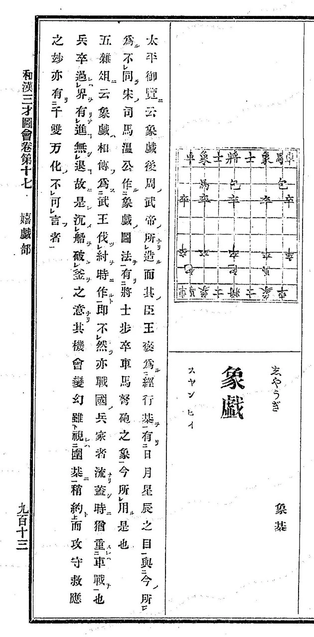 象戱편001。相傳爲武王伐紂時作。卽不然。亦出於戰國兵家者流。蓋時猶重車戰也。【《後周書》。周武帝作象戱。《太平御覽》。周武帝所造。而其臣王襃爲經行棋。有日月星辰之目。與今所爲不同。宋司馬溫公作象戱圖法。有將士、步卒、車馬、砲弩之名。今所用是也。我東俗名將棋。《和圖會》作將戲、將棋。與我所稱同。而今誤爲博戲云。】