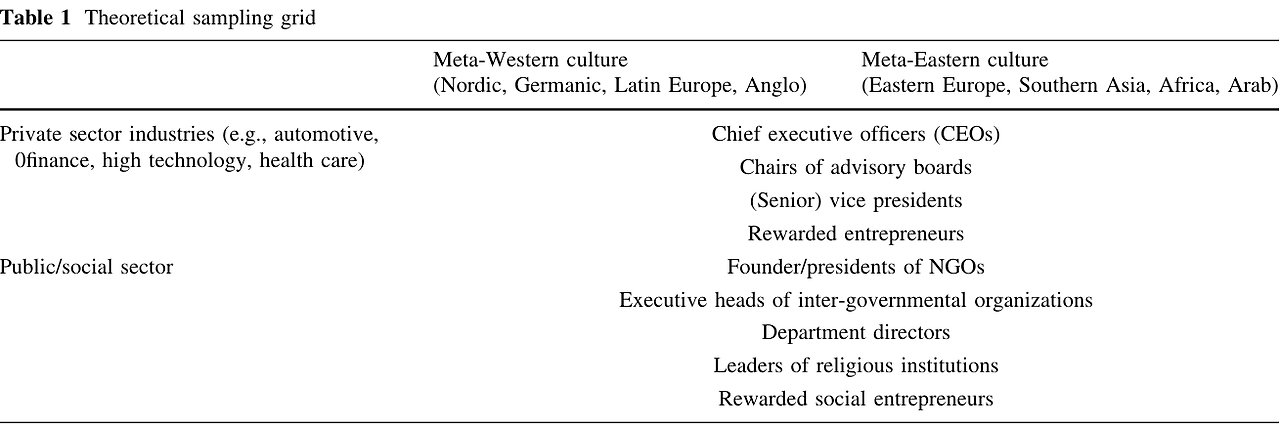 질적 연구 방법은 관련된 관점을 의도적으로 통합하기 위해 이론적 표본 추출이 필요하다 (Strauss and Corbin 1998). 우리의 조사 질문에 따르면, 우리는 인터뷰 대상자의 사회 및 부문의 문화적 배경 측면에서 우리가 추구하는 다양성을 매핑하기 위해 이론적 표집 격자를 작성했다 (표1 참조). 이 격자를 따라, 우리는 서양/동양 문화와 민간 및 공공/사회 부문의 중역, 설립자, 고위 경영진 및 수상 경력이 있는 창업가를 대상으로 했다.