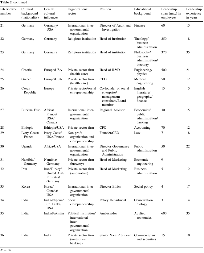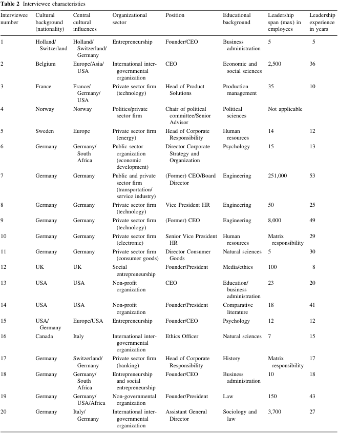 10개의 GLOBE 문화 클러스터 중 8개를 포괄하는데, 4개의 클러스터는 메타-서부 지역 (게르만 유럽, 북유럽, Anglo, 및 라틴 유럽)이며, 다른 4개의 클러스터는 메타-동부지역(남아시아, 동유럽, 아프리카, 및 아랍)으로 (Gupta et al. 2002; House et al. 2004), 우리의 참여자들은 India, Greece, Korea, Namibia, Burkina Faso, Uganda, Sweden, America, Korea, Germany, Belgium, United Kingdom, Norway, the Netherlands, etc. 에서 왔으며, 그들의 업무경험의 문화적 중심은, 예를 들면, Ivory Coast, India, Sri Lanka, Ethiopia, Rwanda, Italy, South Africa, East Africa, France, America, Germany, Sultanate of Brunei, Korea, and Latin America 가 포함된다. 인터뷰 대상자는 평균 49세였다 (중위수는 45세, 최소 연령은 28세, 최대 연령은 80세). 참가자들의 평균 리더십 경험은 20년이었다 (중위수는 17년, 최소 기간은 2년, 최대 기간은 53년). 참여자들의 평균 리더십 범위는 8,112명이었다 (중위수는 33명, 최소인원은 3명, 최대 인원은 251,000명). 표2는 인터뷰 대상자 특성에 대한 자세한 개요를 제공한다.