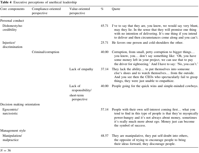 표 4는 비윤리적인 리더십에 대한 인식과 그 발생 빈도에 대한 텍스트 분석에서 나타난 범주를 보여 준다. 개인적 행동에 관하여, 비윤리적 지도자는 부정직하고 (45.71 %) 불공정한 (25.71 %) 것으로 나타난다. 게다가, 법규준수-지향적인 관점에서, 비윤리적인 지도자들은 법을 어기고 부패와 다른 범죄 행위에 관여하는 (40.00%) 비행을 저지르는 사람으로 묘사되었다. 가치-지향적인 관점에서 볼 때 비윤리적인 지도자는 책임감이 부족한 (40.00%) 흐리멍텅한 사람 (37.14%) 으로 나타났다. 지도자의 의사 결정 지향과 관련해, 우리가 인터뷰 대상자들은 비윤리적 지도자들은 자기 중심적이며 주로 자신의 이익을 추구한다고 (57.14%) 알려준다. 경영 방식에 있어서, 인터뷰 대상자들의 인식은 비윤리적인 지도자들이 다른 사람들을 조종하고 오용하는 경향이 있다는 (48.57%) 것을 보여 주었다.