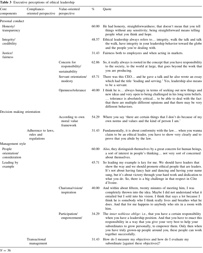 이해를 용이하게 하기 위해, 우리는 발생하는 범주를 개인 행동, 의사 결정 방향 및 관리 스타일과 같은 각 상위 제목으로 분류했다. 또한, 특히 문화와 분야에 걸쳐 자주 언급되는 (>40%) 윤리적 리더십의 핵심 범주들 간을 구별하였는데, 법규준수-지향과 가치-지향 관점의 둘다와 관련되는 핵심 범주 및 구성개념의 법규준수-지향 또는 가치-지향 관점 어느 하나를 더 특별하게 반영하는 핵심범주 등이다 (법규준수-지향과 가치-지향 관점 사이의 심층 비교는 "토의" 절을 보시오). 표3은 각 범주와 발생 빈도를 보여준다.