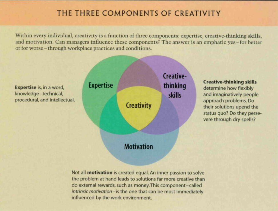 창조적인 사람들이 마이클 조단과 같은 슈퍼 스타인 경우는 드뭅니다. 오늘날 비즈니스 세계에서 이루어지는 대부분의 창의적인 작업은 그의 이름이 역사 책에 절대 기록되지 않는 사람들에 의해 이루어집니다. 그들은 전문 지식, 훌륭한 창의적 사고 기술, 높은 수준의 내재적 동기 부여를 가진 사람들입니다. 중요한 점은 관리자가 그러한 사람들의 특성을 파괴하는 대신, 지원하는 환경을 의식적으로 구축하는 조직에서 그들이 일한다는 것입니다.