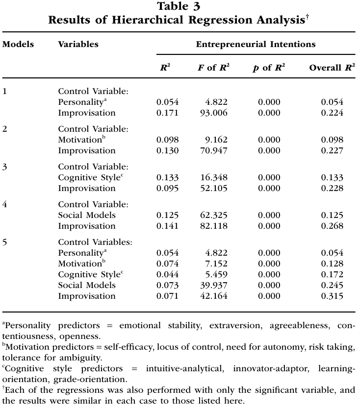 전체적인 검사로서, 우리는 성격, 동기부여, 인지방식 및 사회모형이 동시에 통제될 때 임시변통이 창업 의도의 차이를 설명하는지 여부를 결정할 수 있는지 궁금하다.
