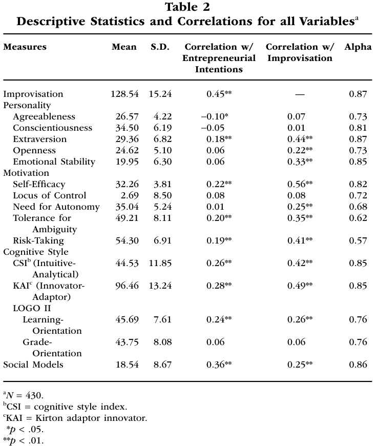 평균, 표준 편차, 이변량 피어슨 상관 계수 및 모든 변수에 대한 크론바흐 값이 표 2에 제시되어있다. 창업의 의도와 다른 변수들 사이의 가장 높은 상관 관계는 임시변통이었는데, 그것은 새로운 사업을 시작하려는 참가자들의 의도에 대한 차이의 20.3 % (p <.01) (H1을 지지) 를 설명한다.