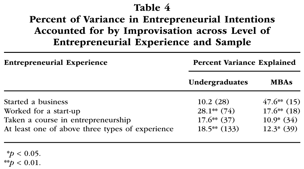 표 4에서 볼 수 있듯이, MBA 학생들에 대한 후속 연구는 일반적으로 학부 표본을 사용한 초기 연구 결과의 발견을 뒷받침한다. 그러나 기업 경험 전반에 걸쳐 학부생과 MBA 학생 표본 간의 임시변통 성향에 의한 창업 의도에 설명된 차이의 정도에는 몇 가지 주목할 만한 차이가 있다. 아마도 가장 흥미로운 것은 사업을 시작한 사람들의 차이일 것이다. 이러한 개인들에게 임시변통과 창업 간의 관계는 학부생보다 MBA 학생들에게 훨씬 컸다. 이것은 MBA 학생들의 경험의 결과일 수 있으며, 그들은 유망한 새로운 벤처 기업을 시작할 가능성이 훨씬 높다, 반면에 경험이 적은 학부생들은 취미로 사업을 시작했을 가능성이 높으며, 임시변통이 필요한 압력을 덜 경험하였을 수 있다. 반대로, 창업 의도의 차이는, 창업기업을 위해 일한 사람들과 창업교육 과정을 밟은 사람들의 경우에는, MBA 학생들과 비교했을 때 학부생들의 임시변통 성향에 의해 훨씬 더 많은 부분이 설명되어진다. 이는 창업 전문가 및 실무자가 현실세계에 대한 경험이 풍부한 MBA 학생 보다는 학부생들의 창업 의도에 더 큰 영향을 미칠 수 있음을 시사한다.