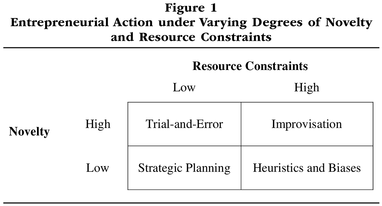 예를 들어 정보와 시간이 풍부한 경우에는 전략적 계획이 수립될 수 있다. 시간과 정보가 모두 제한되어 있는 경우에라도, 기업가가 문제 또는 기회에 대해 어느 정도 친숙해지게 되면, 인지적 휴리스틱과 편향이 가용되어 작동될 수 있다. 자원이 풍부하지만 상황의 참신함이 매우 높을 때, 기업가는 시행-착오 접근을 할 여력이 있으며 추가 정보를 수집할 필요가 있을 것이다. 마지막으로, 자원 제약이 엄청나고 기업가가 새로운 문제나 기회에 직면하게 되면 임시변통이 가장 합리적인 행동으로 보인다. 이 경우, 기업가는 "올바른 방향으로 나아갈" 수 있는 오직 한 번의 기회를 가진다. 시간과 자원에 대한 제약은 계획이나 시행-착오를 허용하지 않으며 극단적인 참신함은 휴리스틱과 편향을 사용할 수 없게 만든다. 그러나 이러한 조건 하에서 기존의 전략 계획 및/또는 인지 편향과 휴리스틱은 임시변통의 상황 중 (또는 즉석에서) 이를 벗어나기 위한 유용한 준거(referents)로 작용할 수 있다.