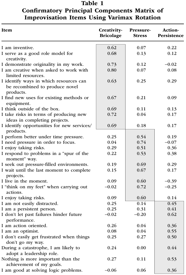 27 개 항목의 도구는 임시변통 성향을 측정하기 위해 현재 연구의 일부로 개발되었다. 이 도구는 3 개의 등급이 있으며 각 등급은 9 개의 항목으로 구성됩니다. 첫 번째 차원은 창의성과 브리콜라쥬 (α = 0.89) 와 관련이 있으며, Vera (2002)의 작업에 이어 Tierney, Farmer와 Graen (1999)에서 부분적으로 채택되었다. 이 차원은 개인이 가용 자원을 재결합하여 제약 조건 하에서 새로운 솔루션을 생산할 수 있는 정도를 나타낸다. 이 차원에서 높은 사람들은 독창성을 발휘할 수 있는 기회를 모색 할 것이다. 두 번째 차원은 압력이 충만하여 스트레스가 많은 환경 (α = 0.83) 에서 기능하고 또 뛰어난 능력과 관련이 있다. 이 차원은 불확실하고 급변하는 환경에서 개인이 능숙해질 수 있는 능력을 나타낸다. 이 차원에서 높은 개인은 상황을 이겨내고 압박 속에서 최선을 다하는 경향이 있다. 최종 차원은 즉흥성과 집요성 (α = 0.70) 과 관련이 있으며, Vera (2002)의 연구에 이어 Unger와 Kernan (1983)과 Moorman and Miner (1998)에서 부분적으로 채택되었다. 이 차원은 매 순간 목표 달성 및 문제 해결에 대한 개인의 행동 방향 및 결정을 나타낸다. 이 차원에서 높은 개인은 분석보다는 행동을 선호하는 경향이 있으며, 당면의 문제에 고도로 집중한다. 이 개인들은 기회주의적이며 킬러 본능으로 행동한다. 측정의 3 차원 구조는 주성분 분석을 사용하여 확인되었다. 이러한 차원은 즉석에서의 개인의 전반적인 경향을 나타내는 총점을 형성하기 위해 합산된다 (α = 0.87). 따라서 높은 점수는 임시변통 행동에 대한 선호도를 나타낸다. 측정치의 3 주 검사-재검사는 전체 등급에 대해 0.85의 상관 계수를 나타냈다. 각 항목과 함께 3 요소 확증 주요 구성 요소 행렬은 표 1에서 볼 수 있다.
