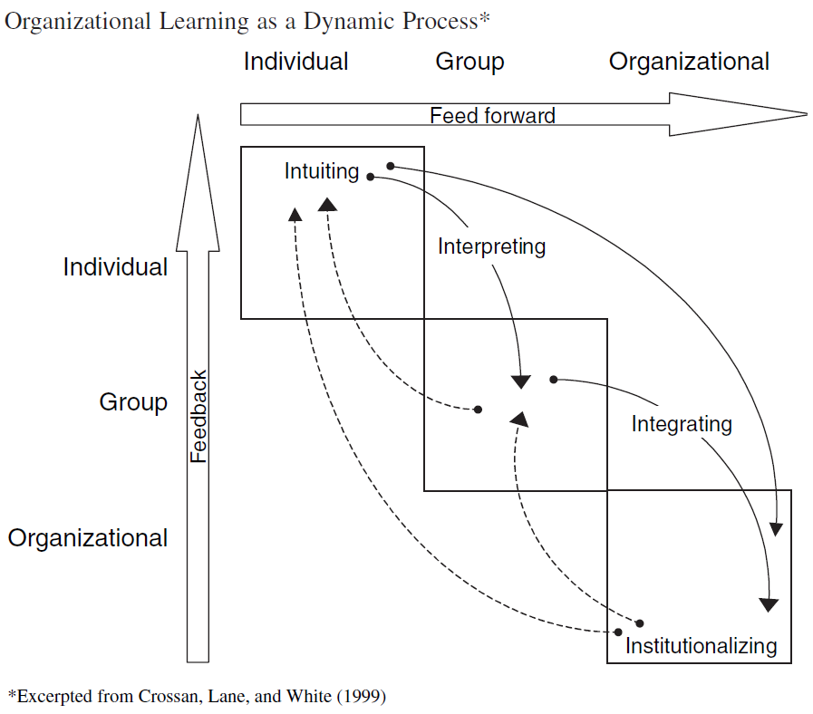 즉, 학습은 외부 사건이 전개될 때 개인이 자신의 이전 경험과 패턴의 인식에 기초하여 사업 기회에 대한 직관을 발달시킬 때 시작된다. 개인은 이들 패턴을 진행하는 것을 감지하기 위해 - 통찰력이나 생각을 해석하고 그것을 말로 표현하기 위해 사용한다. 개인의 해석은 아이디어를 공동 탐구, 해석, 통합에 관여할 수 있는 그룹과 공유함으로써 강화되거나 강화될 수 있으며, 이를 실현 가능한 사업 제안에 대한 공동의 이해로 발전시킬 수 있다. 시간이 지나면서 공유된 이해는 예를 들어 시스템, 구조, 전략 및 절차의 형태로 조직 수준에서 제도화될 수 있다. 개인에게서 유래하여 집단과 조직으로 옮겨지는 학습을 피드-포워드(feed-forward) 학습이라고 한다. 피드-포워드 학습은 탐색과 관련이 있다. 그러나 학습도 피드백 과정을 통해 조직에서 개인과 집단으로 이전된다. 예를 들어, 보상 시스템은 개인이 주목하는 것을 안내하는 반면, 조직 구조는 확실히 집단 학습에 영향을 미칠 수 있다. 피드백 학습은 학습의 활용과 관련이 있다.