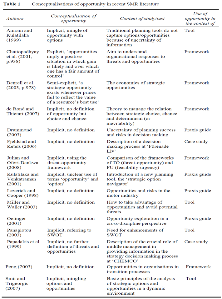 SMR 문헌에 '기회'에 대한 명시적 개념화나 정의가 존재하는지 여부를 발견하기 위해 우리는 문헌 분석을 제시한다. 이 문헌 분석은 전략 계획과 기회를 다루는 저널 논문들의 검토에 기초한다. 지난 10년을 다루고 있으며, 주요 전략 경영 저널 [Academy of Management Journal 및 Academy of Management Review (AoM / Rev), Business Strategy Review (BSR), Journal of Business Strategy (JBS), Long Range Planning (LRP), Strategic Management Journal (SMJ)] 과 데이터베이스 검색에서 얻은 추가 참조물에서의 광범위한 문헌 검색을 기반으로 하고 있다. 검색은 논문의 초록뿐만 아니라 제목에 '기회(opportunity)'와 '기회들(opportunities)', '옵션', '찬스', '선택' 및 'SWOT'라는 키워드를 검색하는 방식으로 수행됐다. SMR의 영향력 있는 저널에 중점을 두어 '기회'에 관한 다양한 문헌의 흐름을 발견하기 위한 기초가 되는 것처럼 보이지만, 우리는 이 주제에 대해 간략하게 다루고 있는 16 개의 논문만 발견했다 (표 1). 10년의 기간에 이 수치는 다소 낮은 것으로 보인다. 이는 SMR에서 기회의 본질에 대한 논의가 무시된 것으로 보임을 의미한다.