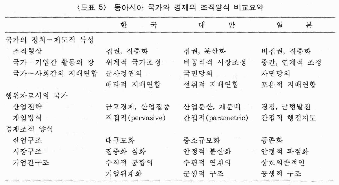 ... 동아시아 3개국이 수출지향적 산업화라는 발전전략을 추구하는 과거 4반세기 동안에 제조업 부문에서 나타나는 상이한 조직양식에 대한 원인을 분석하고자 한다. 이를 위하여 두 가지를 전제한다... 첫째... 자원의 효율적 배분을 담당하는 중요한 제도적 기제가 시장이기 보다는 개입능력을 지닌 국가라는 점을 강조하고자 한다. 둘째로, 경제조직은 제도적 환경에 내재화되어 있다는 전제이다...