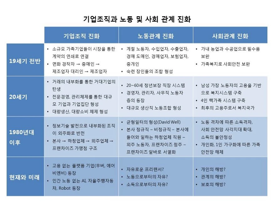 4단계에 걸친 기업조직의 변화와 이에 따른 노동, 사회관계의 변화