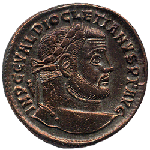 많은 황제들과 마찬가지로 세금 제도를 개정하려고 계획했던 로마 황제 디오클레티아누스(284-305 A.D.)의 두상이 새겨진 청동 주화.