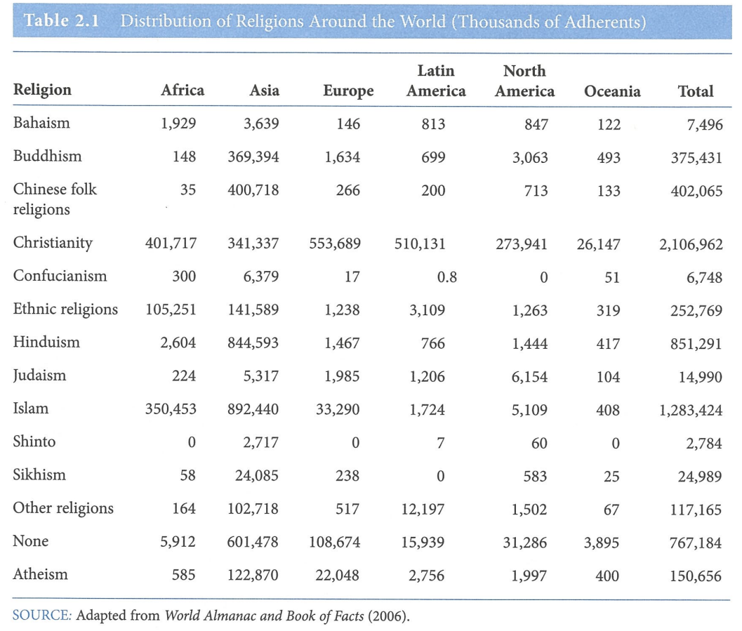 현재 기독교가 전 세계에서 가장 많은 지지자를 보유하고 있지만 추종자의 비율은 가까운 장래에 상대적으로 안정적이며 이슬람교와 힌두교도 (부분적으로 출생률의 차이로 인해) 세계 인구의 증가하는 비율을 대표한다(Barrett, Kurian, & Johnson, 2001). 표 2.1은 전 세계의 주요 종교의 대략적인 지리적 분포를 보여준다.