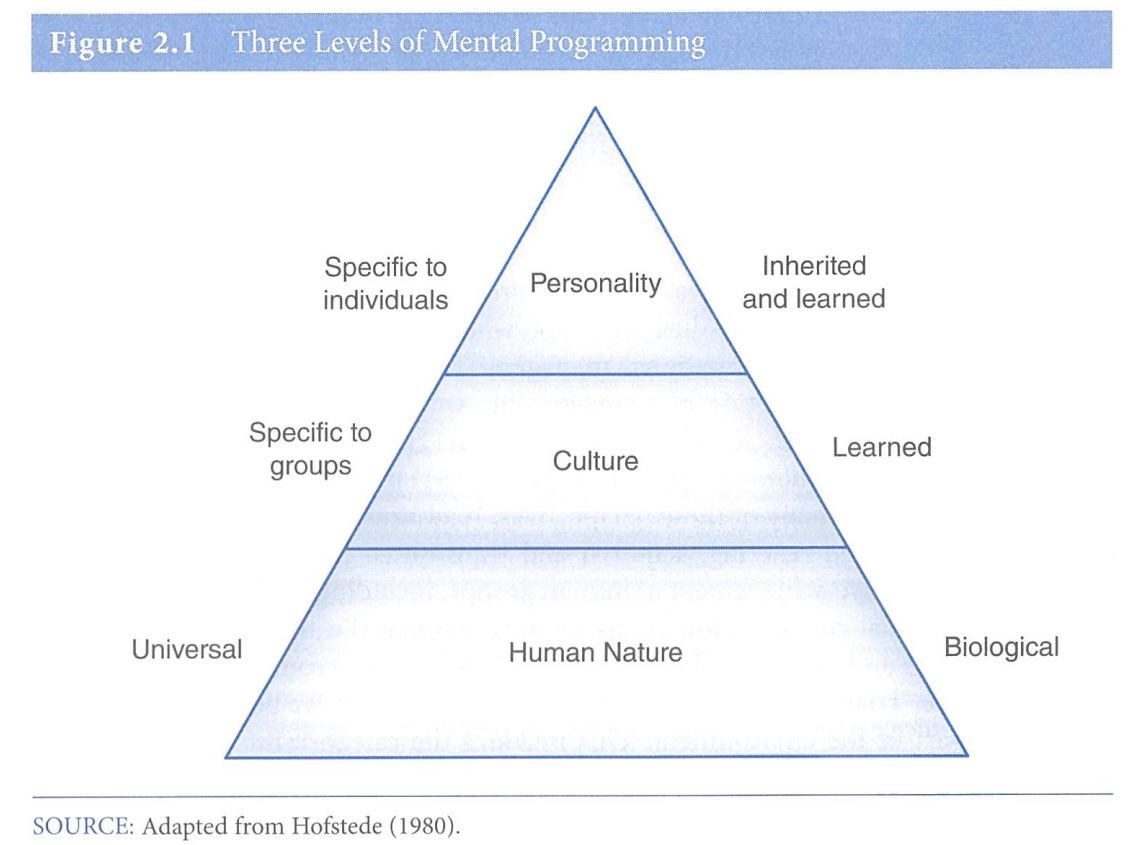 문화는 특정 집단의 구성원이 공유하는 것이다. 홉스테드(Hofstede, 1991)는 한 측면에서는 보편적인 인간성과 다른 측면에서는 독특한 성격 사이에 있는 정신적 프로그래밍으로서 문화를 기술할 때 이 점을 잘 설명한다. 그림 2.1에서 보듯이 개인은 그들이 환경과 상호 작용하는 방법에 대해 세 가지 수준의 프로그래밍을 마음 속에 가지고 있다.