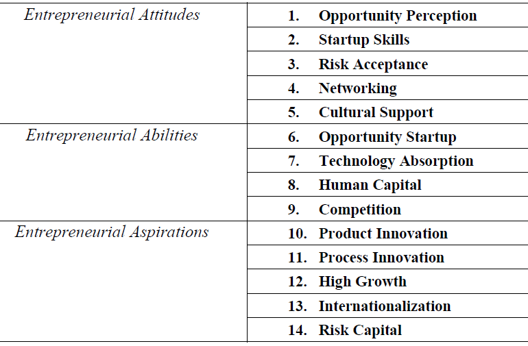 우리 연구의 형식은 지표의 본질에 대한 창업가적 활동을 위해 제시된 지표(Acs, Szerb, & Eloyd, 2018)에서부터 중요합니다.