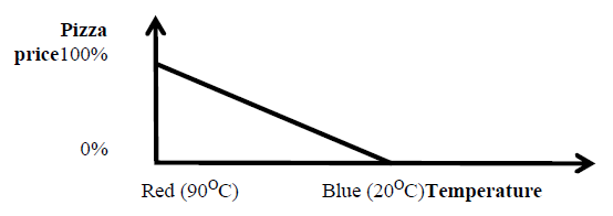 Goldenberg and Mazursky (2002)는 그들의 책 [제품 혁신의 창의성]에서 피자 배달의 예에서 변수 간의 종속성을 변경하는 원리를 제시했습니다. 고객은 배달로 받은 피자가 충분히 뜨겁지 않아 실망하는 경우가 많습니다. 판매자는 피자 온도가 60 ℃ 미만인 경우 고객에게 50 % 할인을 보상하고 싶습니다. 이 솔루션은 또한 피자 온도와 고객 당 가격이라는 두 가지 변수 간의 연결을 기반으로 합니다. 그림 6과 유사한 그래프를 사용하여 이를 표시할 수 있습니다. 피자의 온도에 따라 지속적으로 색상이 (예를 들면 뜨거운 피자인 빨간색에서 차가운 피자인 파란색으로까지) 변하도록 작은 온도 센서를 피자 상자에 배치하여 이 아이디어를 더욱 구체화할 수 있습니다. 따라서 피자 가격은 그림 7과 같이 100 %에서 0 %로 떨어집니다.