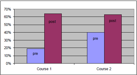 위에서 언급한 2 개의 SIT 과정 참가자들은 과정을 배우기 전과 후에 (다른 버전으로) 6 개 문항의 시험에 답했습니다. 시험 문제에 대한 전체 정보와 이 연구의 결과는 이전 간행물에 나와 있습니다 (Barak, 2006). 여기에서는 이 연구에서 발견한 결과의 일부만 제시합니다. 그림 8은 과정수강 후 시험에서 학생들이 쓴 독창적인 아이디어의 비율(전통적인 답변 대비)이 과정수강 전 시험의 답변에 비해 훨씬 더 높음을 보여줍니다.