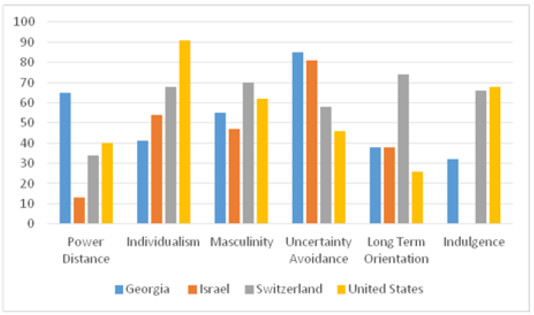 The Hofstede Insights Culture Compass™는 선택된 국가의 사람들과 협력하면서 문화적 가치 선호도와 잠재적인 행동 함정의 영향을 이해하는 도구입니다. 그림 12는 조지아, 이스라엘, 스위스 및 미국의 문화적 가치를 비교한 것입니다. (Resource: https://www.hofstede-insights.com/country-comparison/georgia,israel,switzerland,the-usa/)