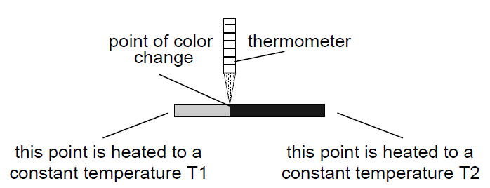 해결책 4. 시간에서의 온도를 공간에서의 온도로 변경하여 색상 변화 지점의 온도에 대한 완전히 정적인 측정을 만든다 (그림 3-6 참조). 이 아이디어는 한쪽 끝은 일정한 온도 T1으로, 다른 한쪽 끝은 일정한 온도 T2로 가열하여 금속막대 표면의 색상을 분산시킴으로써 구현된다.