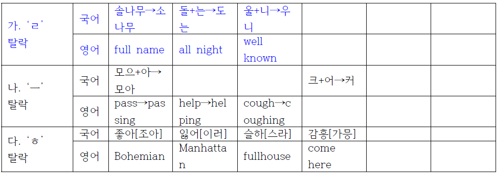 2. 상기표에서 파랑색으로 나타낸 것은 필자가 보기에 영어를 공부할 때, 매우 주의해야 할 한국어의 간섭현상이다.