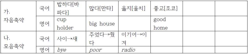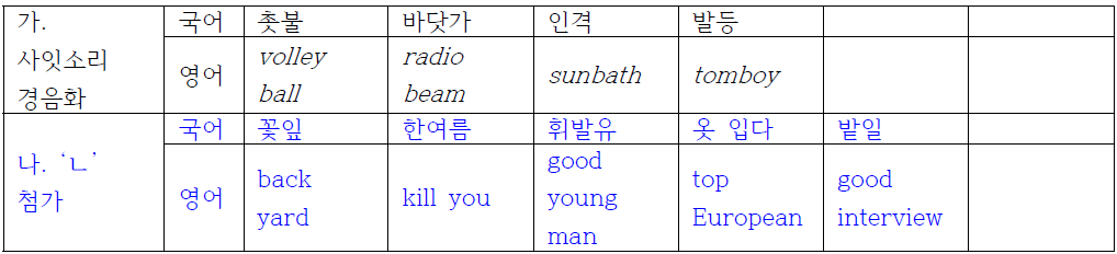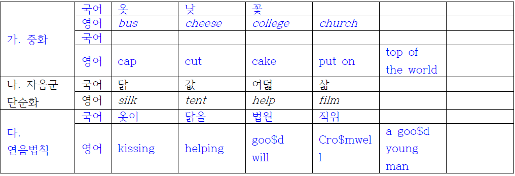 1. 상기표에서 이탤릭체로 된 것은 한국어의 음운현상이 영어 발음에 간섭현상을 일으키지 않는 것들이라고 저자가 정의한 것이다.