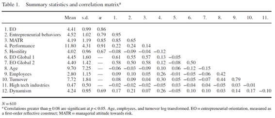 우리는 EO 문헌에서 흔히 볼 수 있는 5개 항목 Likert 척도를 사용하여 환경 적대감을 측정했다 (Covin and Slevin, 1989). 우리는 총매출액, 현금흐름, 자기자본이익률(ROE), 순이익률, 이익을 통한 성장 자금 조달 능력에 대한 고위 관리자의 만족도를 나타내는 5가지 지표를 사용하여 성과를 측정했다. 표 1에는 EO를 단일 차원 복합 구성개념으로 포함하는 우리의 핵심 구성개념을 위한 요약 통계 및 상관 매트릭스가 포함되어 있다. 기업가적 행동은 하위 차원의 반영 측정 구성개념으로서, 그리고 EO의 두 글로벌 지표. 두 글로벌 지표는 모두 EO의 개념적 영역의 전체를 포착하는 내용-타당성이 있는 측정이기 때문에 두 글로벌 지표 사이에 강한 공분산이 예상된다. 또한 우리는 다음과 같은 통제변수를 포함했다. 기업 수익 로그, 기업 직원 로그, 기업 연령 로그, 기업이 첨단 기술 산업에 속해 있는지 여부를 나타내는 더미 변수, 그리고 환경 역동성.