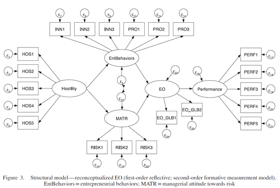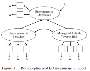 재개념화 하에서, 그러므로 우리는 그림 1에 표시된 대로 EO에 대한 다음 측정 모델에 다음사항들이 포함될 것을 제안한다. (1) 두 개의 하위 차원의 식별을 용이하게 하기 위한 최소 3개의 반영 지표 (Bollen, 1989 참조), (2) 상위 EO 구성개념을 형성하는 하위 차원, 그리고 (3) 구성개념-수준의 교란항 식별에 사용되는 두 개의 추가적인 글로벌 반영 지표의 포함. 특히 이 측정 모델은 MIMIC 모델(Multiple Indicators, Multiple Causes/다중 지표, 다중 원인; (MacKenzie et al., 2011 참조) 과 실증적으로 동등하다. 그러나 개념적으로 해석은 식별을 용이하게 하는 2개의 추가 내용-타당성 효과 지표와 함께 2개의 하위 차원에 의해 정의된 잠재변수 EO로 더 잘 이해된다 (MacKenzie et al., 2011). 앞의 해석의 강점은 EO의 개념 모델과 그것의 조작화에 사용된 측정 모델 사이의 존재론적 일관성이다.