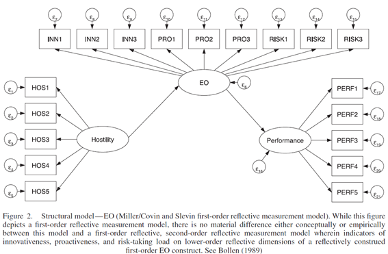 반영 측정 모델에서 연구자는 관심 현상의 근본적인 변화가 모든 지표의 변화를 동시에 동일한 크기로 유도한다는 존재론적 가정을 한다는 점을 상기하시오. 이는 지표들이 모두 동일한 공통 원인을 공유하기 때문이다. 지표들이 동등하게 유효하다고 가정할 때 지표들은 상호 교환 가능하고 완벽하게 공변한다 (Bollen, 1989). 그러나 George and Marino (2011)가 언급했듯이, EO의 지표들 사이에 그리고 EO의 지표들과 상위 EO 사이의 관계가 반영 규격과 일치하지 않음을 제안하는 이론적 주장과 이를 지지하는 실증적 증거가 있다. 가장 중요한 증거는 혁신성, 주도성 및 위험감수성이 서로 다른 법칙론적 관계를 나타내며 완벽하게 공변하는 것은 아니라는 것을 보여주는 연구이다 (Lumpkin and Dess, 2001).