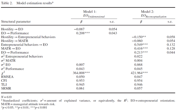 그런 다음 그림 3과 같이 재개념화된 EO 변수를 사용하여 구조 모델을 추정했다(오차 항 공분산 수정은 간결성을 위해 제외됨). 이 모델에서 우리는 적대감에서 기업가적 행동으로의 경로와 적대감에서 위험향 관리자적 태도로의 경로를 추정했으며, 이 두 구성개념은 차례로 상위 EO 구성개념의 하위 예측 변수이며, 구성개념-수준 교란항은 두 개의 글로벌 반영지표로 식별된다. 이전과 마찬가지로 우리는 EO와 성과 간의 관계도 추정했다. 이 모델은 수용 가능한 적합도를 보여주었다 (χ2 =421.964, p<0.001; RMSEA=0.047; CFI= 0.954; TLI=0.946; SRMR=0.057). 우리의 기대와 일치하게 적대감과 기업가적 행동 사이에 부정적이고(-) 유의미한 관계를 관찰했다(β=−0.150, p<0.01). 또한 적대감과 위험향 관리자적 태도 사이의 경로는 유의미하지 않았다(β=−0.060, p>0.1). 우리는 또한 EO와 성과 간 양의 관계를 발견했다(β=0.213, p<0.001). 강건성 테스트로 통제 변수를 사용하여 모델을 다시 추정했다. 이 분석은 추정된 핵심 계수의 부호나 유의성에 중대한 변화가 없음을 보여주었다. 마지막으로, 우리의 모델 적합 지수는 그림 2와 3에서 볼 수 있듯이 모델 간에 거의 변경되지 않았다는 점에 주목할 가치가 있다. 이는 Jarvis et al.(2003) 의 관찰과 일치한다. 모델 적합 지수는 측정 모델의 오규격에 의해 거의 영향을 받지 않으며 오규격의 영향을 평가할 때 신뢰할 수 없다. 두 구조 모델의 주요 결과를 표 2에 요약한다.