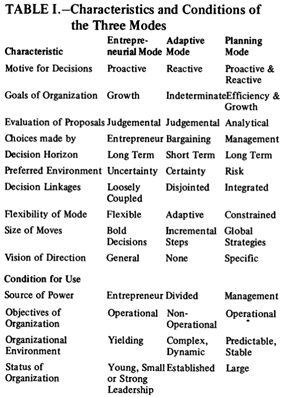 조직은 어떻게 중요한 결정을 내리고 전략을 형성하기 위해 함께 연결합니까? 지금까지 비즈니스에서는 전략 수립으로, 정부에서는 정책 결정으로 알려진 이 중요한 과정에 대한 체계적인 증거가 거의 없습니다. 그러나 경영 및 행정에 관한 문헌은 이 주제에 대한 일반적인 견해로 가득 차 있습니다. 이들은 세 가지 그룹 또는 "양식"으로 나뉩니다. 일부 고전 경제학자들과 많은 현대 경영학 저자들의 글에서 볼 수 있는 기업가적 양식에서는 한 명의 강력한 리더가 조직을 대신하여 대담하고 위험한 행동을 취합니다. 반대로, 많은 비즈니스 및 정부 의사 결정 학파가 설명한 적응 양식에서 조직은 어려운 환경에 작고 분리된 단계로 적응합니다. 마지막으로, 경영 과학 및 정책 과학의 지지자들은 미래를 위한 명시적이고 통합된 전략을 계획하기 위해 형식적 분석이 사용되는 계획 양식을 설명합니다.