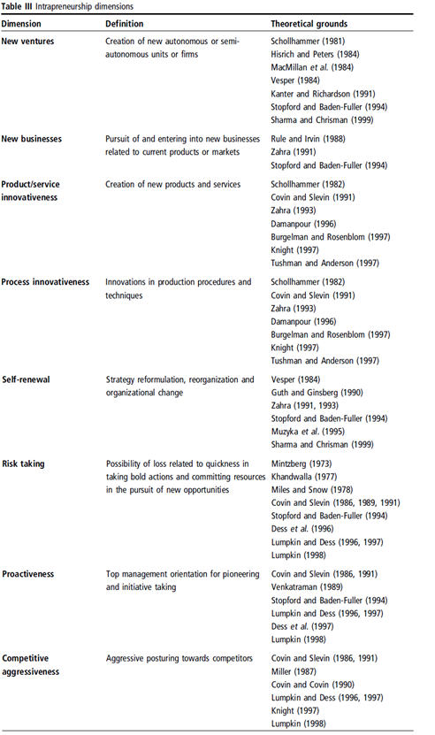 사내기업가정신은 이제 기업가정신과 전략적 관리 문헌의 경계를 아우르는 이전 이론(기업가 지향 및 기업기업가정신)의 두 가지 주요 흐름을 기반으로 하는 보다 완전한 통합 개념으로 개발되었다. 우리의 제안은 사내기업가정신이 8가지 고유한 관련 구성 요소(신규 벤처, 신규 비즈니스, 제품/서비스 혁신성, 프로세스 혁신성, 자기 갱신, 위험 감수, 주도성 및 경쟁적 공격성)로 구성된 다차원적 개념으로 보아야 한다는 것이다. 이러한 사내기업가정신 차원을 분석, 육성 및 발전시킴으로써 관리자는 조직의 성과를 크게 향상시킬 수 있다.