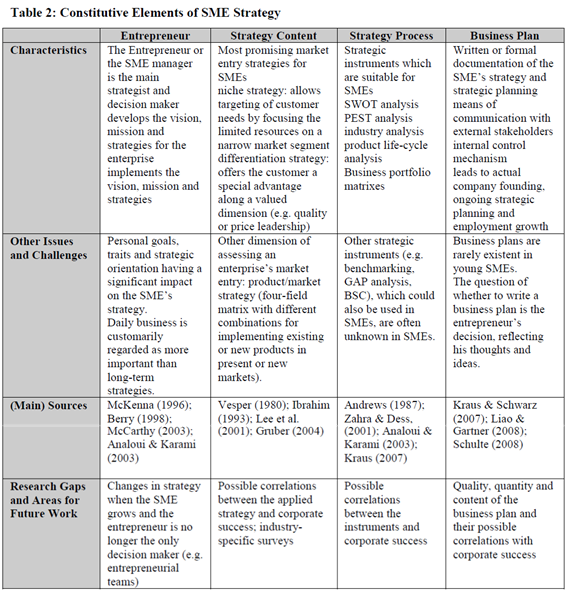 중소기업 전략 적용은 기업가정신과 전략 경영 사이의 교차점의 주요 부분이다(예: Chan & Foster, 2001). 중소기업 내 전략의 내용 및 프로세스 측면(예: 사업 계획의 형태로 항상 상호 연관되어 있음) 다음으로 기업가의 역할은 특히 중요하다. 다음 표와 하위 절은 중소기업 전략의 네 가지 주요 구성 요소와 특성을 예시적으로 보여준다.