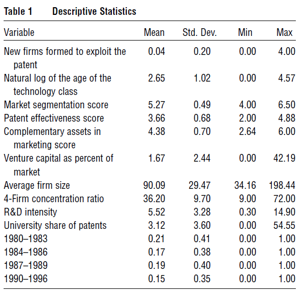 셋째, 특허는 유용성, 참신성 및 가치에 대한 특허청 표준을 충족해야 하기 때문에 특허발명은 새로운 기술 기회의 비교적 균질한 집단이다 (Malerba and Orsenigo 1996). 모든 기술 기회의 세계는 특허 받지 않은 발명품들이 특허청 기준을 충족할 필요가 없기 때문에 특허 발명의 세계보다 훨씬 더 큰 이질성을 가진다. 이러한 이질성은 관찰되지 않은 요인들이 기업 형성 결정에 영향을 미칠 확률을 증가시킨다. 특허 발명의 풀을 탐구함으로써, 나는 기업의 설립 경향에 영향을 미칠 가능성이 있는 관찰되지 않은 특성의 변동(variance)을 최소화할 수 있고, 따라서 회귀 분석에서 편향된 추정의 가능성을 줄일 수 있다.