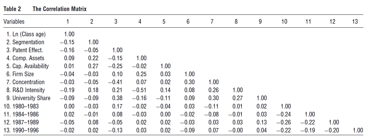 표 2에서 알 수 있듯이 독립 변수 중 어느 두 개 변수 간에 가장 높은 상관관계는 연구개발 강도와 보완적 자산 사이의 r =-051이다. 행렬에 나타난 중간정도의 높은 상관관계는 독립 변수가 우리가 아직 완전히 이해하지 못하는 방식으로 연관되어 있음을 보여준다. 이러한 상관관계가 통계적 결과에 걸림돌이 되는 다중 공선성 문제를 일으키지는 않지만, 기업 형성을 예측하는 요소들 중 어느 것도 완전히 독립적인 것은 없다는 것을 암시한다.