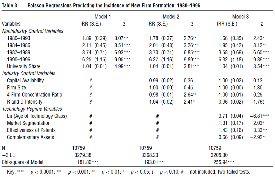모형 3은 예측 변수를 추가한다. 이러한 변수를 포함하면 양호한 적합 모형이 생성된다 (chi-square = 25594, p < 00001). 게다가 그 결과는 네 가지 가설을 뒷받침한다. 가설 1과 일관되게, 기술 등급이 오래될수록, 기업 형성의 발생률이 낮아진다(IRR = 071, p < 00001). 가설 2와 일관되게, 사업 계열이 시장 세분화를 지향할수록, 기업 형성의 발생률이 높아진다(IRR = 131, p< 001). 가설 3과 일관되게, 사업 계열에서의 특허의 효용성이 클수록, 기업 형성의 발생이 커진다(IRR = 143, p < 0001). 가설 4와 일관되게, 사업 계열에서의 마케팅과 유통에서 보완자산의 중요성이 클수록, 기업형성의 발생률이 낮아진다(IRR = 066, p < 001).