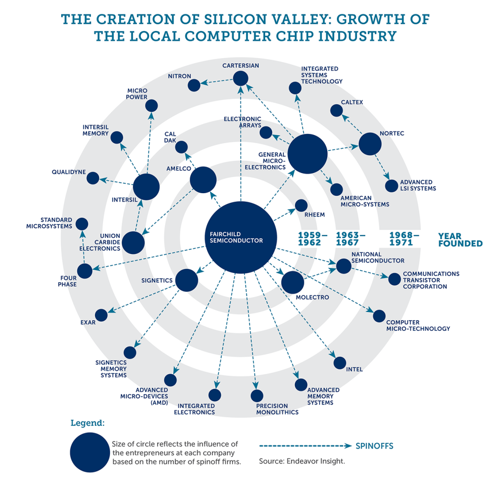 쇼클리 반도체에서 앞서 언급한 "개인적 갈등"은 실리콘 밸리의 역사에 대한 실질적으로 모든 연구의 중심에서 찾을 수 있다. 미국 전역의 어느 산업단지에서나 쉽게 찾아볼 수 있는 이 분쟁이 이러한 독특한 연쇄 반응을 유발하고 차세대 스타트업을 탄생시킨 것은 캘리포니아에서만 일어난 일이라는 사실에 놀라지 않을 수 없습니다. 이들은 이후 이러한 핵분열과 재생산을 계속했다.
