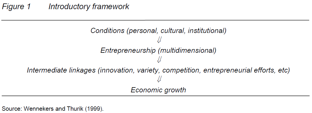 기업가정신은 제대로 정의되지 않은 다차원 개념이다. 기업가적 활동의 범위를 정의하고 측정하는 어려움은 그것들이 경제적 성과에 미치는 영향을 측정하는 것을 복잡하게 만든다. 성장 과정에서 기업가정신의 역할을 이해하려면 프레임워크가 필요한데, 왜냐하면 경제 성장에 미치는 영향을 설명할 다양한 중간 변수나 연계가 있기 때문이다. 이러한 중간 변수의 예로는 혁신, 공급의 다양성, 기업 (경쟁)의 진입 및 퇴출, 기업가의 특정 노력 및 에너지 등이 있다. 기업가정신에 대한 몇 가지 조건이 제공되는 그림 1을 참조하라. 이러한 조건에는 기업가정신과 문화 및 제도적 요소의 기원에 있는 개인적 특성이 포함된다.