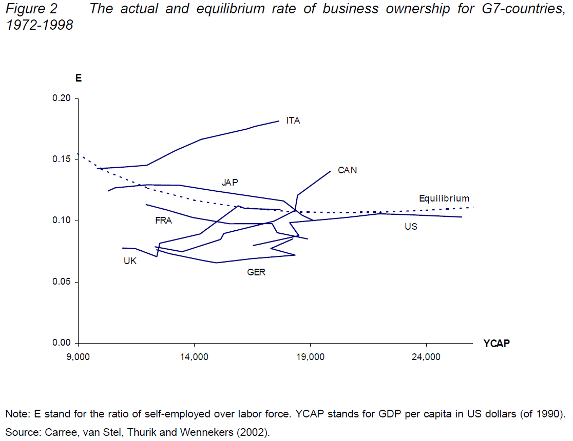 문헌의 네 번째 줄기는 자기고용이 성장에 미치는 영향에 초점을 맞추기 시작했다. Blanchflower (2000, p.497)는 OECD 회원국들의 자영업 비율이 증가가 경제성장을 증가시켰다는 증거를 찾지 못했다. 그러나 그는 국가 간 비교 가능성 부족으로 어려움을 겪고 있는 수정되지 않은 OECD노동력 통계 자료를 사용하였는데, 그 자료는 추가적인 경우에서도 계수 절차의 변화로 인해 시간 경과에 따른 비교 가능성이 부족하다. 최근의 논문에서, Carree, van Stel, Thurik and Wennekers (2002)는 경제 발전의 비교적 높은 수준에서 "균형" 사업 소유 비율에서 벗어나는 국가들이 경제 성장에서 고통을 받는지 여부를 조사한다. 그들의 관점에서 사업소유주의 실제와 균형비율의 이탈은 중기적으로 경제의 성장잠재력을 감소시킬 것이다. 사업소유주들의 부족은 국가경제의 정태적인 효율성과 경쟁력에 해로운 영향을 미치면서 경쟁을 감소시킬 것 같다. 또한 다양성, 학습 및 선택이 감소하고 따라서 동적 효율성(혁신)이 손상된다. 반면에, 자기 고용의 과잉은 평균적인 규모의 운영이 최적 이하로 유지되도록 할 것이다. 그것은 다른 곳에서 더 생산적으로 할당될 수 있었던 자본과 인적 에너지를 흡수하는 다수의 한계 기업들을 초래할 것이다. 그들은 사업 소유의 "균형" 비율을 자본당 GDP의 함수로써 결정하는 오류-수정 모델을 개발한다. 수정된 OECD노동력 통계 자료를 사용하여 그들이 추정한 "균형" 관계는 실제의 (수정된) G7국가 데이터와 함께 그림 2에 제시된다. 추정 결과에 따르면 실제 사업 소유주 수가 "균형" 비율에서 벗어나면 경제 성장에 상당한 부정적 영향을 미친다.