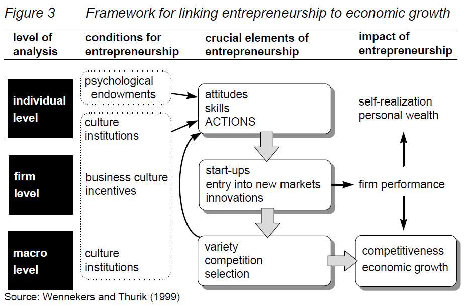 그림 3은 문헌의 다양한 가닥들로부터 얻은 많은 통찰에서 영감을 받은 한 프레임워크를 보여 준다. 기업가정신과 경제 성장을 연계하는 것은 기업에 대한 개인 수준과 거시 수준을 연결하는 것을 의미하기 때문에 세 가지 수준의 분석이 구별된다.
