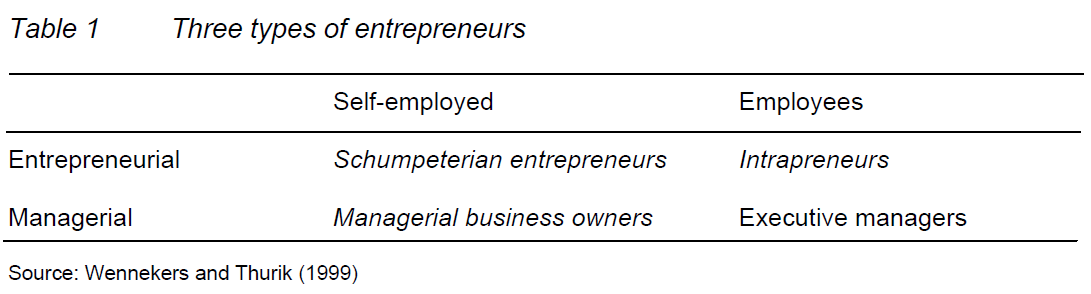 구어에서 기업가, 자영업자, 사업가와 같은 많은 용어들이 무분별하게 사용되기 때문에, 그것의 조작화와 측정은 결코 명백하지 않다. 하지만, 사람들은 몇 가지 실용적인 구별을 할 수 있다. 첫째로, 기업가적과 관리자적 개념 간에는 조직화와 조정화라는 의미에서, 둘째, 사업주 또는 자영업자(법인의 소유-관리자 포함)와 종업원 사이. 자영업자 대 종업원과 기업가적 대 관리자적의 이러한 이중 이분법에 기초하여 세 가지 유형의 기업가를 구별할 수 있다. 이 세가지 유형은 슘페터적 기업가, 사내기업가 그리고 형식적인 의미에서만 기업가인 관리자적 사업 소유자이다. 이는 표 1에 설명되어 있다.