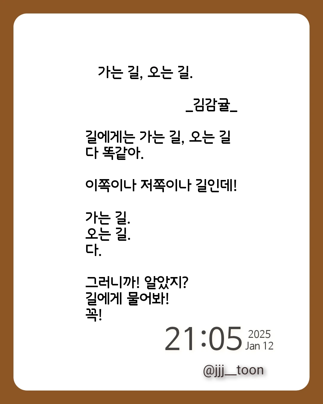 김감귤의 브런치입니다. 시, 짧은 글, 일기를 쓰기도 하며, 자유롭게 글을 쓰고 생각을 표현하는 활동을 좋아합니다. 개인 가치관이나 경험에 비춰 글을 읽을 수 있다고 생각합니다.
