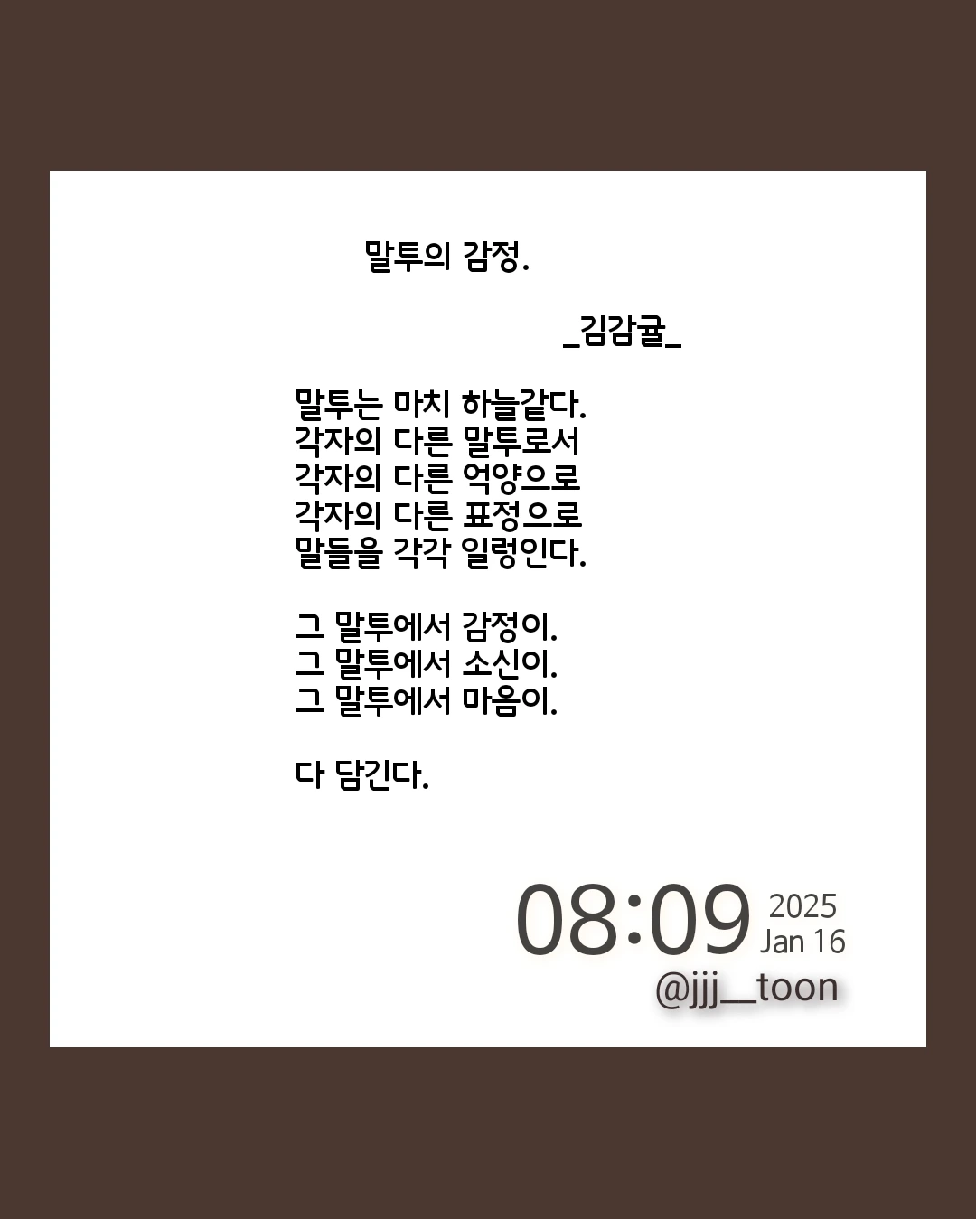 김감귤의 브런치입니다. 시, 짧은 글, 일기를 쓰기도 하며, 자유롭게 글을 쓰고 생각을 표현하는 활동을 좋아합니다. 개인 가치관이나 경험에 비춰 글을 읽을 수 있다고 생각합니다.