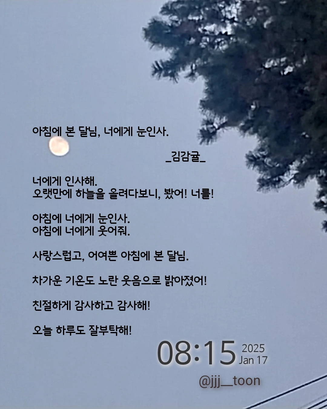 아침에 만나는 풍경을 보면서 하루를 시작하며 시를 써봤습니다. 아침에 만나는 풍경에 감사하면서 좋은 마음을 가지고 시작하자는 의미로써 시를 적어봤습니다.