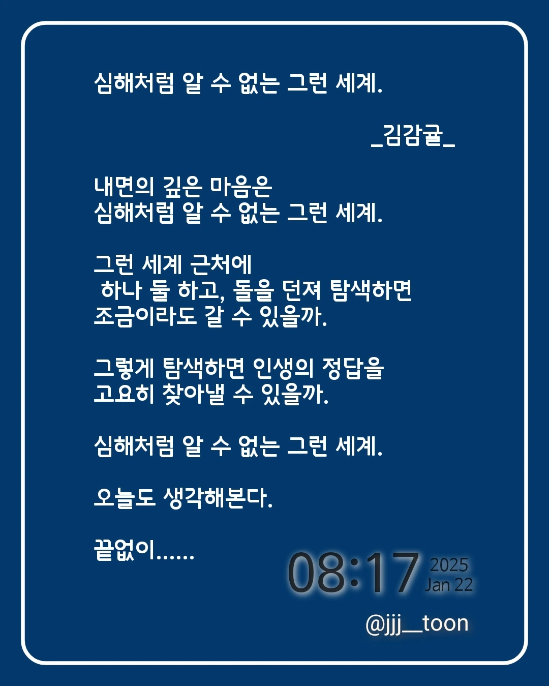누구나 심해처럼 깊은 수렁 속에 빠진 기분을 느낄 때가 있을 것이다. 그런 마음속을 심해라고 표현해 봤다. 아직까지 심해는 알 수 없는 미지의 세계 영역이 많다고 하는데, 마음도 그런 것 같다는 생각에서 기인했다.