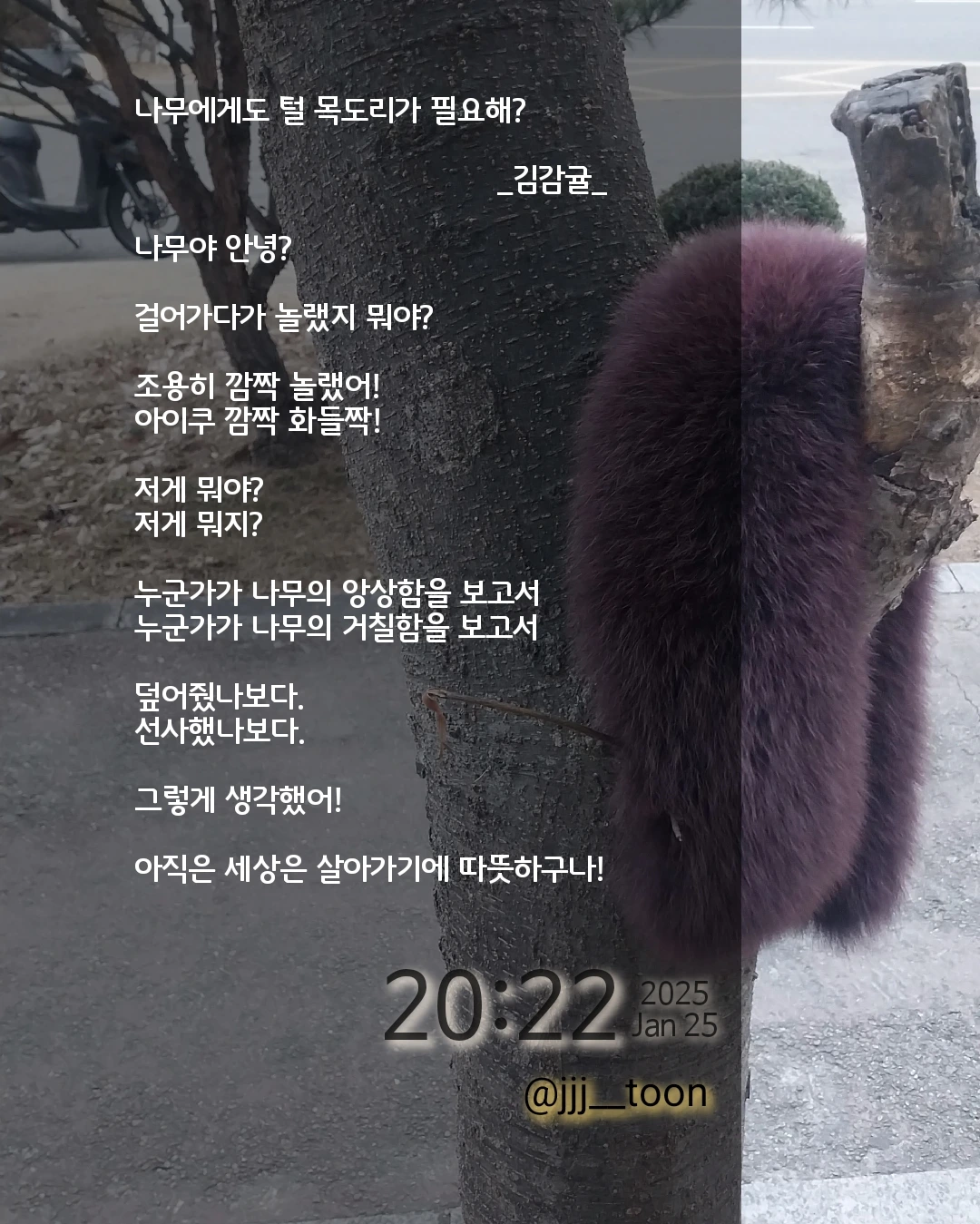 '어쩜 이렇게 독특한 풍경이 발견될까?'라는 생각으로서 이 사진을 찍어 저장해 놨다. 따뜻함이 느껴지는 그런 풍경이었다. 이 분은 어떤 생각으로 이렇게 나무에게 목도리라는 선물을 줬을지에 대해서 생각해 보면서 관련되어 생각한 작은 부분을 시로 표현해 봤다.