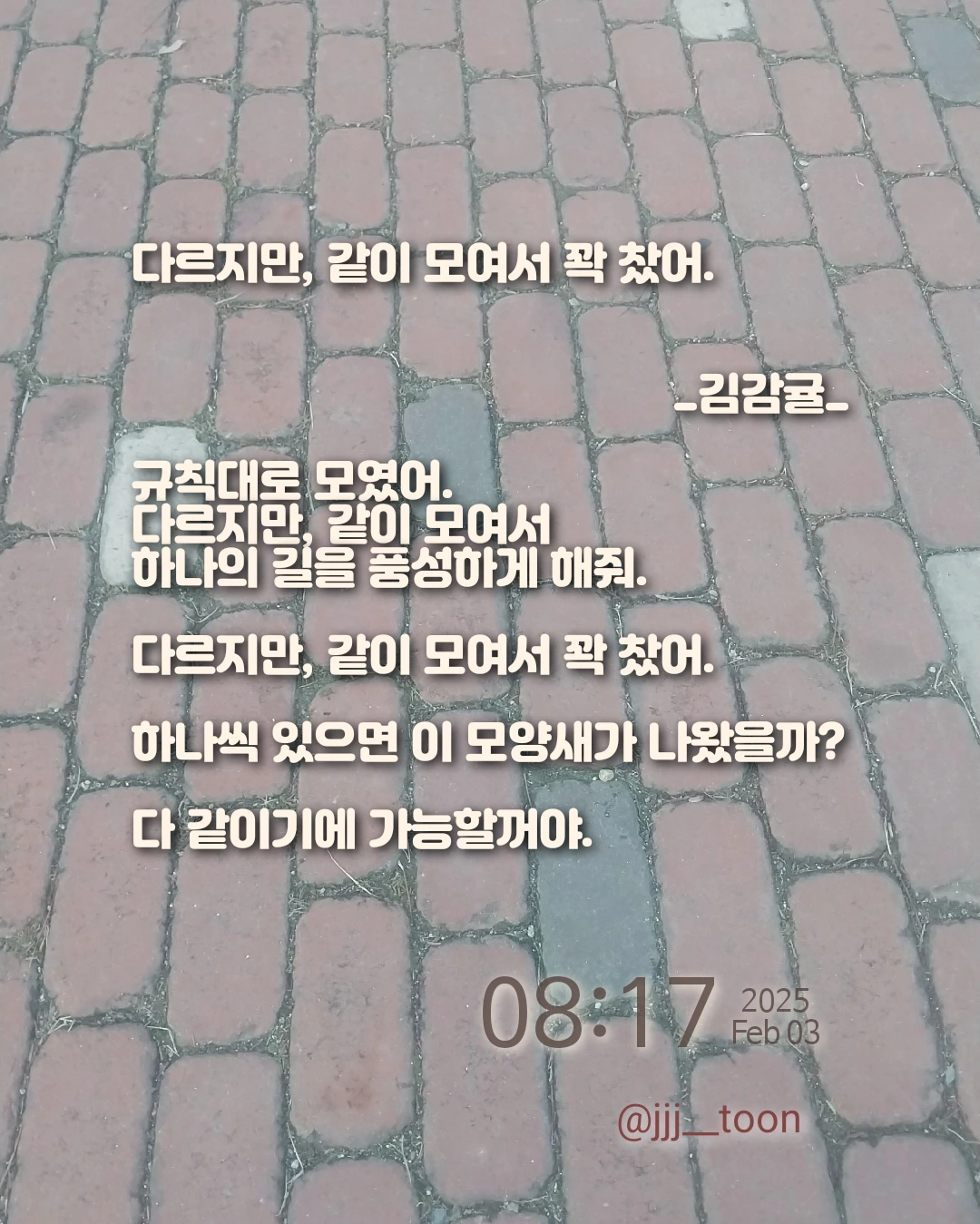 다르지만, 같이 모여서 꽉 찼어. _김감귤_규칙대로 모였어.다르지만, 같이 모여서 하나의 길을 풍성하게 해줘.다르지만, 같이 모여서 꽉 찼어.하나씩 있으면 이 모양새가 나왔을까?다 같이기에 가능할꺼야.