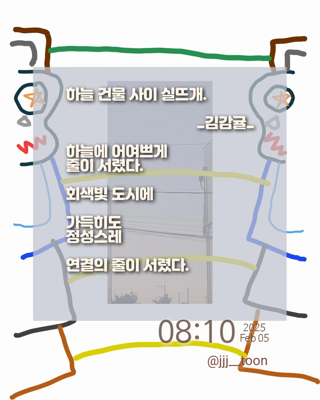 하늘 건물 사이 실뜨개. _김감귤_하늘에 어여쁘게줄이 서렸다.회색빛 도시에가득히도정성스레연결의 줄이 서렸다.