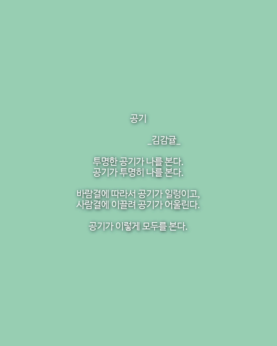 공기 _김감귤_투명한 공기가 나를 본다.공기가 투명히 나를 본다.바람결에 따라서 공기가 일렁이고,사람결에 이끌려 공기가 어울린다.공기가 이렇게 모두를 본다.